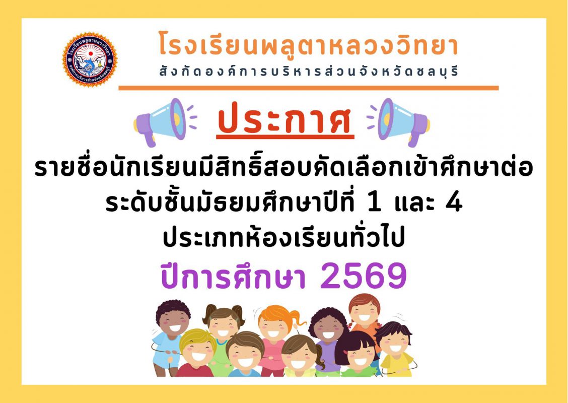 ประกาศต่างๆรายชื่อนักเรียนมีสิทธิ์สอบคัดเลือกเข้าศึกษาต่อระดับมัธยมศึกษาปีที่ 1 และระดับมัธยมศึกษาปีที่ 4 ประเภทห้องเรียนทั่วไป ปีการศึกษา 2569 26 Mar ประกาศโรงเรียนพลูตาหลวงวิทยา รายชื่อนักเรียนมีสิทธิ์สอบคัดเลือกเข้าศึกษาต่อระดับมัธยมศึกษาปีที่ 1 และระดับมัธยมศึกษาปีที่ 4 ประเภทห้องเรียนทั่วไป ปีการศึกษา 2569 หมายเหตุ : ม.1 สอบคัดเลือกวันเสาร์ที่ 28 มี.ค.69 เวลา 08.30-12.00 น. ม.4 สอบคัดเลือกวันอาทิตย์ที่ 29 มี.ค.69 เวลา 08.30-12.00 น. ประกาศรายชื่อนักเรียนมีสิทธิ์สอบคัดเลือก >> PDF : คลิ๊ก ลิงค์ต้นทาง : คลิ๊ก