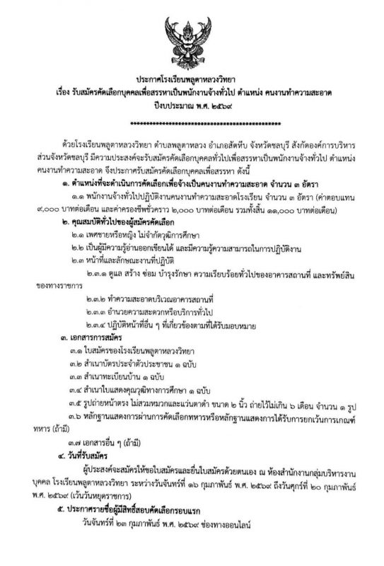 ประกาศต่างๆประกาศรับสมัครคัดเลือกบุคคลเพื่อสรรหาคนงานทำความสะอาด จำนวน 3 อัตรา 11 Feb ประกาศโรงเรียนพลูตาหลวงวิทยา เรื่อง : ประกาศรับสมัครคัดเลือกบุคคลเพื่อสรรหาคนงานทำความสะอาด จำนวน 3 อัตรา Click : Click here