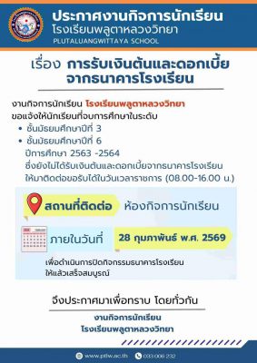 ประกาศโรงเรียนพลูตาหลวงวิทยา เรื่องการรับเงินต้นและดอกเบี้ยจากธนาคารโรงเรียน